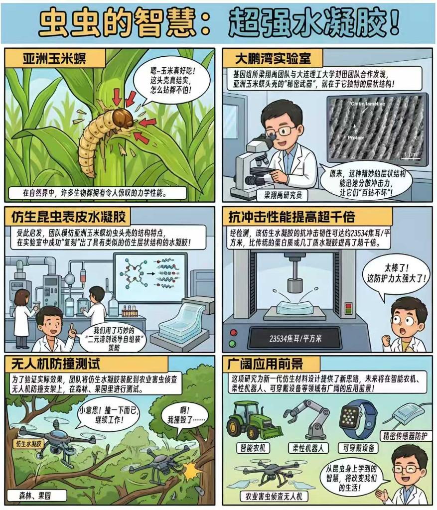 本報(bào)訊(馬昕怡 記者 李爭(zhēng)粉)近日,中國(guó)農(nóng)業(yè)科學(xué)院深圳農(nóng)業(yè)基因組研究所梁翔禹團(tuán)隊(duì)聯(lián)合大連理工大學(xué)受亞洲玉米螟頭殼結(jié)構(gòu)啟發(fā),研制出一種超強(qiáng)耐沖擊水凝膠,可大幅提升無(wú)人機(jī)等設(shè)備在碰撞環(huán)境下的可靠性。相關(guān)研究成果發(fā)表在《先進(jìn)材料(Advanced Materials)》上。