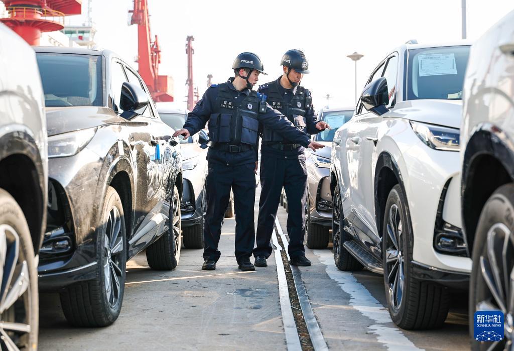 12月17日,在江蘇連云港港,連云港邊檢站民警對即將出口的汽車進行檢查。