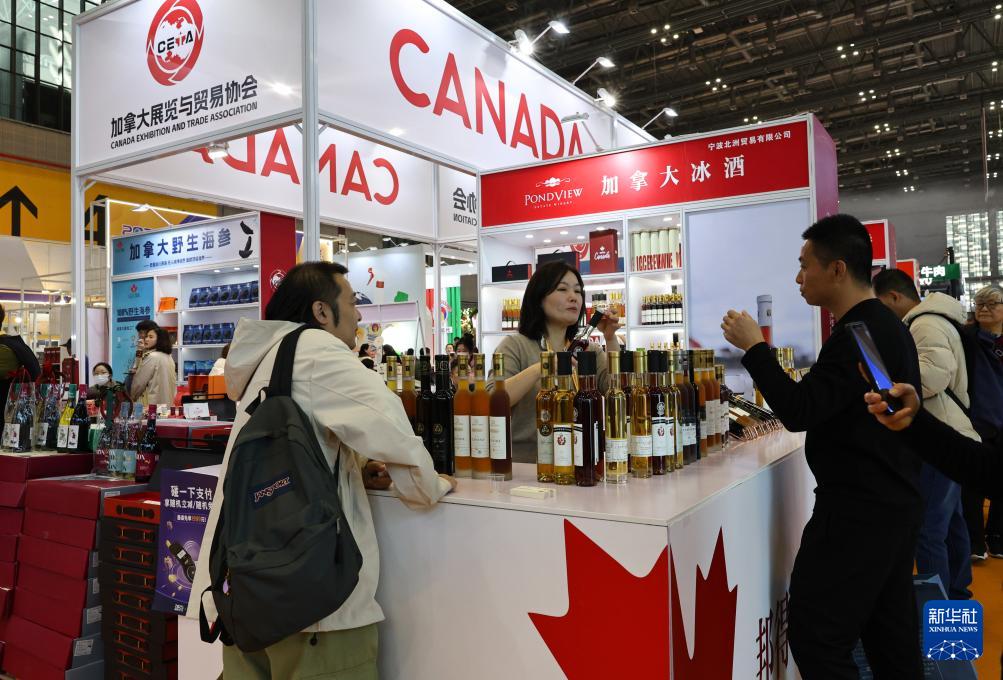 12月19日,參觀者在加拿大商品展臺(tái)前與工作人員交流。