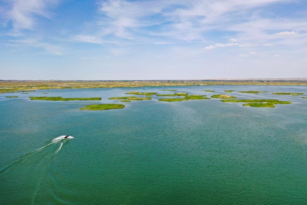6月5日,在巴彥淖爾市磴口縣奈倫湖國家濕地公園,摩托艇行駛在湖面上(無人機照片)。黃河“幾字彎”逐漸展現(xiàn)“金沙藍海綠洲”的美麗畫卷。新華社記者 李志鵬 攝
