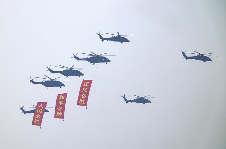 2025年9月3日,紀(jì)念中國(guó)人民抗日戰(zhàn)爭(zhēng)暨世界反法西斯戰(zhàn)爭(zhēng)勝利80周年大會(huì)在北京隆重舉行。這是空中護(hù)旗梯隊(duì)接受檢閱。新華社記者 王婧嬙 攝