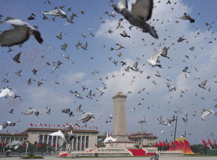 2025年9月3日,紀(jì)念中國(guó)人民抗日戰(zhàn)爭(zhēng)暨世界反法西斯戰(zhàn)爭(zhēng)勝利80周年大會(huì)在北京隆重舉行。這是紀(jì)念大會(huì)現(xiàn)場(chǎng)放飛鴿子。新華社記者 牟宇 攝