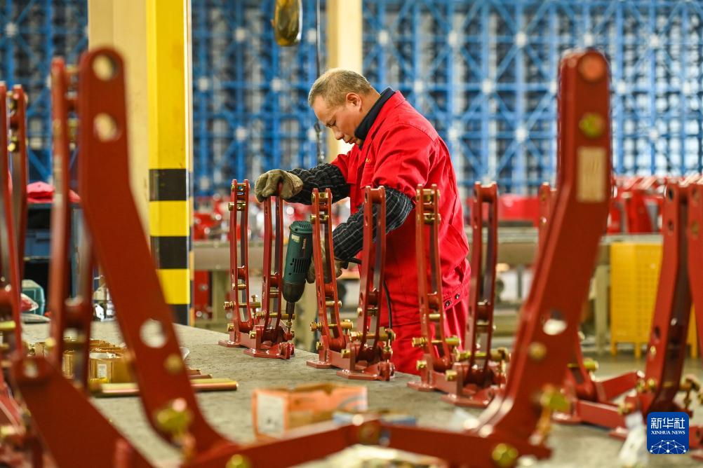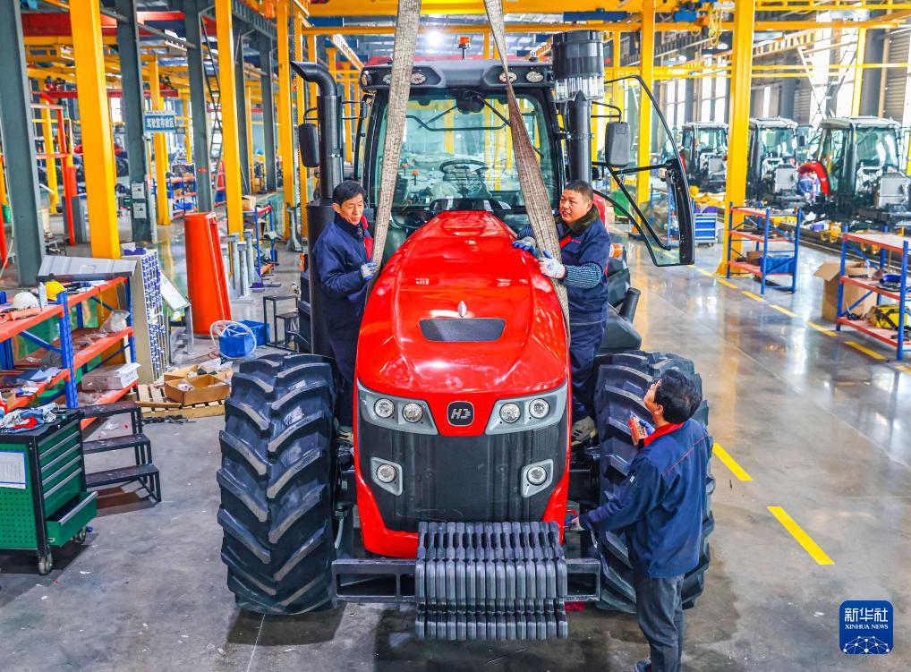 1月5日,在位于江蘇省揚(yáng)州市的金世紀(jì)(江蘇)智能科技有限公司,工人在大馬力全動力換擋智能拖拉機(jī)生產(chǎn)線上作業(yè)。
