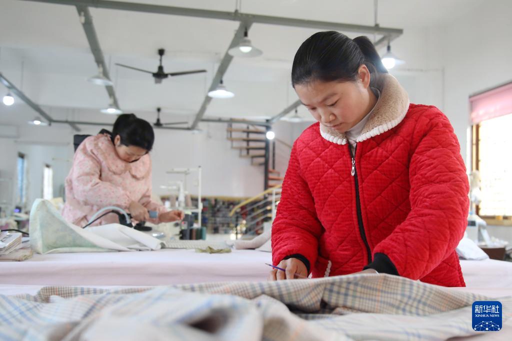 1月5日,工人在湖北省十堰市鄖陽區(qū)柳陂鎮(zhèn)龍韻村一家布藝加工廠忙碌。