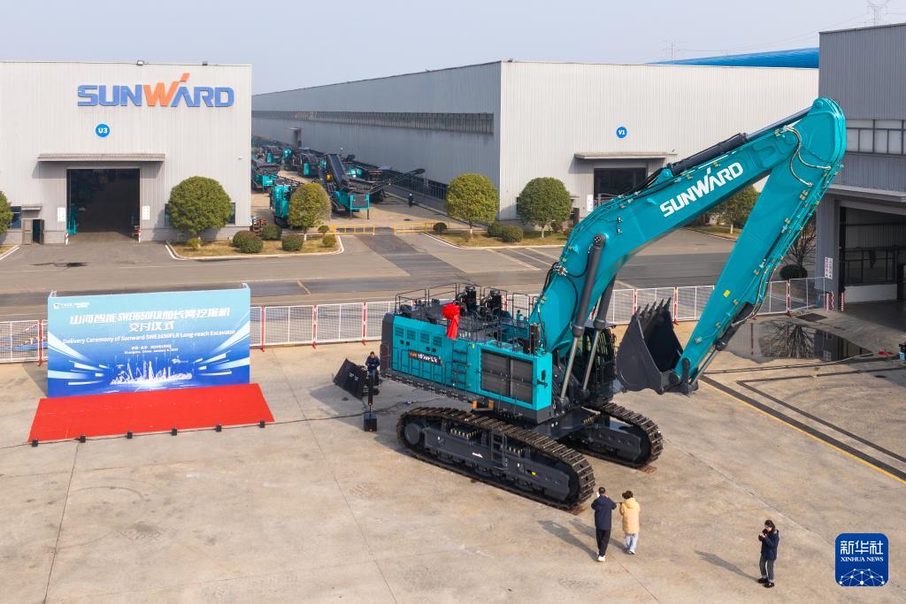 這是1月6日在長沙山河工業(yè)城拍攝的山河智能SWE1650FLR加長臂挖掘機(jī)(無人機(jī)照片)。