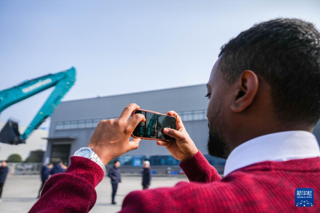 1月6日,在長沙山河工業(yè)城,客戶代表在拍攝SWE1650FLR加長臂挖掘機(jī)。