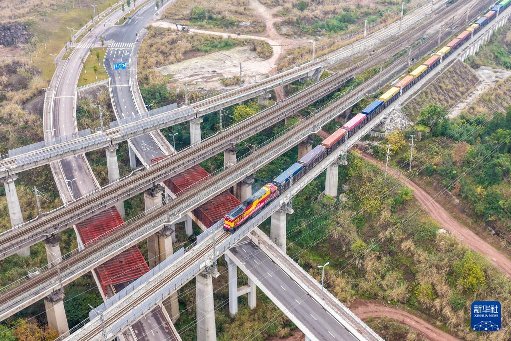 1月7日,鐵海聯(lián)運“重慶造”新能源汽車專列在重慶果園港魚嘴站順利發(fā)車(無人機照片)。