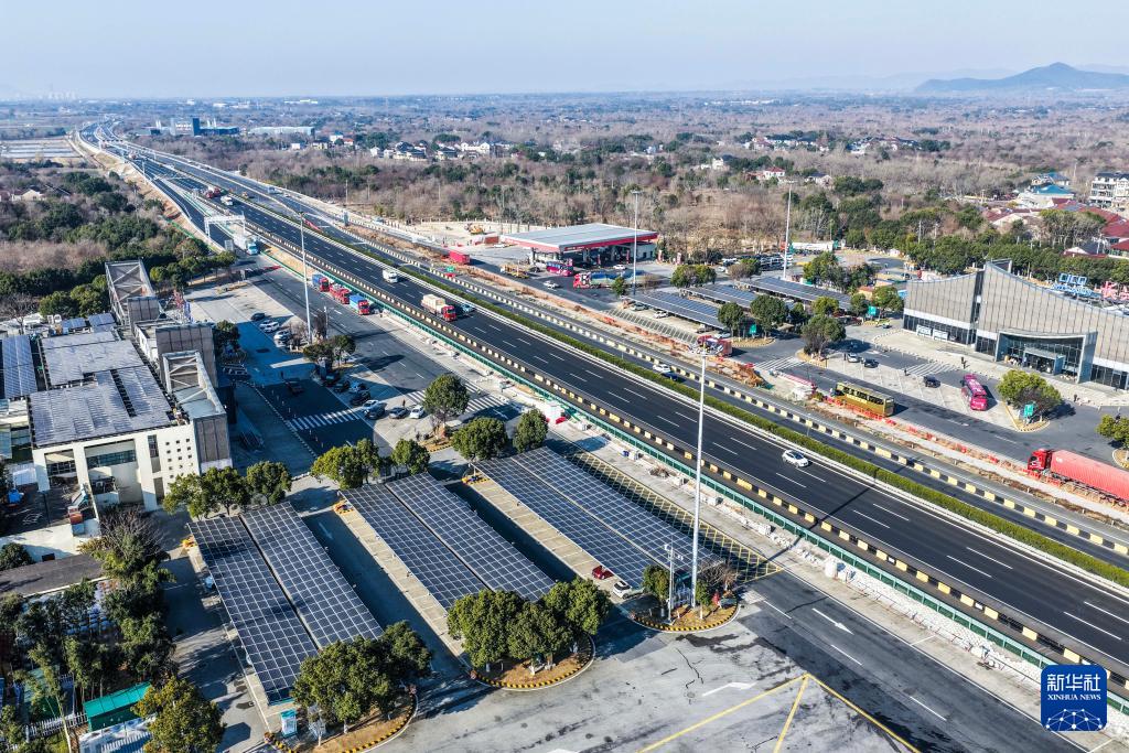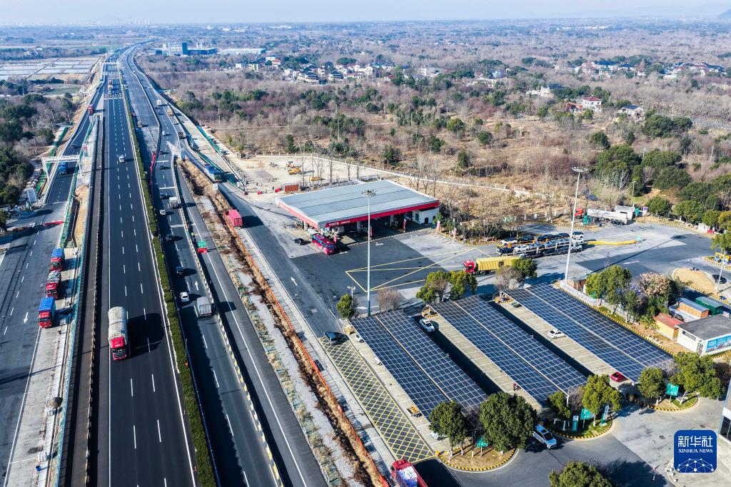 1月7日,空中俯瞰G50滬渝高速長興服務區(qū),太陽能光伏板下是剛剛升級完成的高速服務區(qū)充電站(無人機照片)。