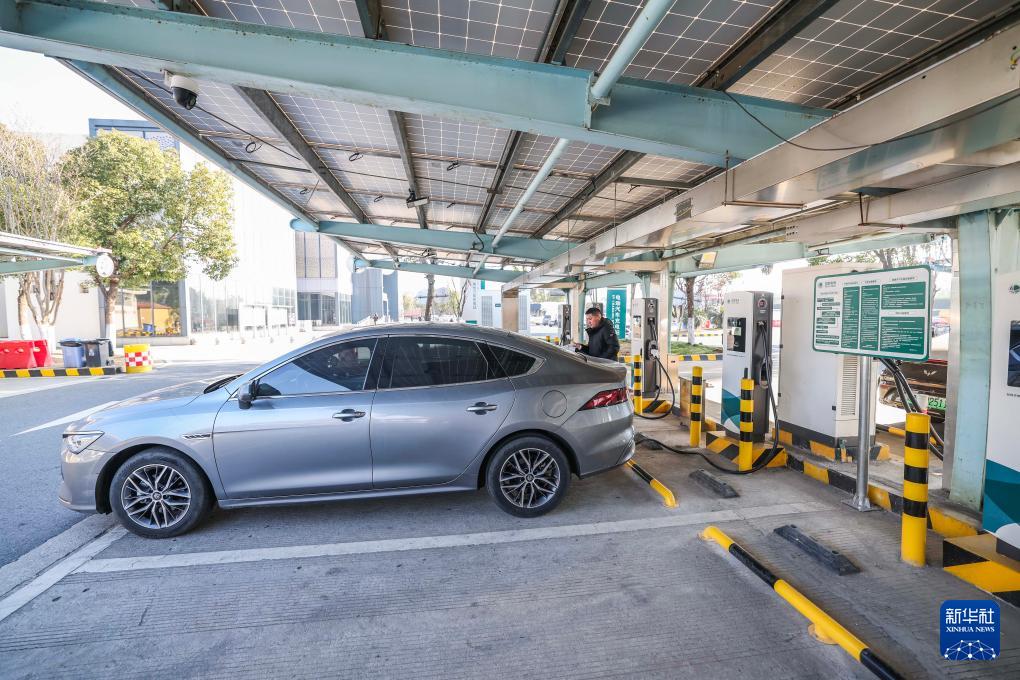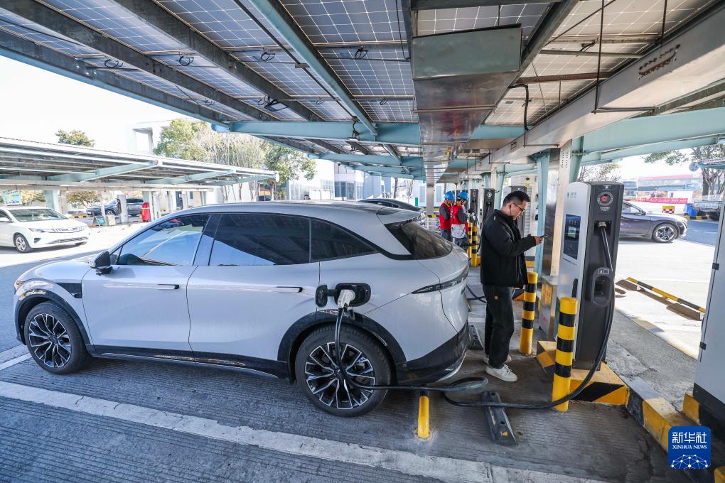 1月7日,在G50滬渝高速長興服務區(qū),新能源車主使用新安裝的大功率充電樁給車充電。