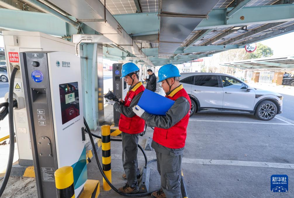 1月7日,國網(wǎng)湖州供電公司工作人員在G50滬渝高速長興服務區(qū)對新安裝的大功率充電樁開展巡檢。