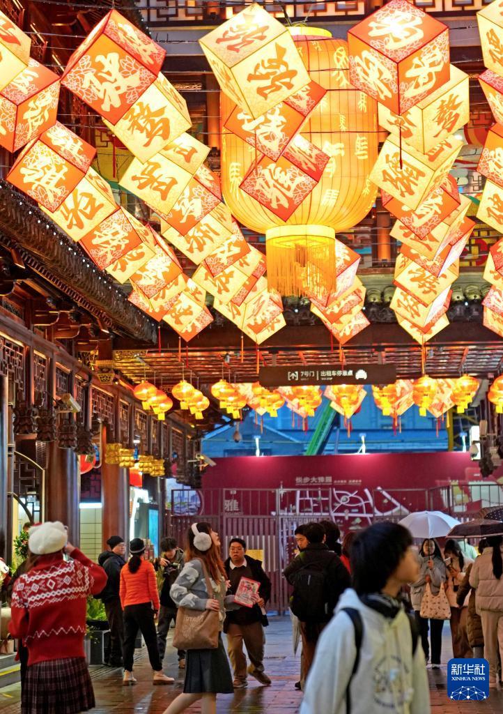 1月26日,豫園燈會上的春聯(lián)與流光溢彩的花燈營造出新春的喜慶氛圍。