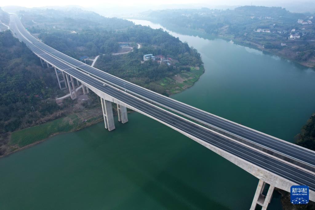 2025年12月28日,工程車輛行駛在銅資高速楊柳灘沱江特大橋上(無人機照片)。該高速公路于2026年1月1日正式建成通車。