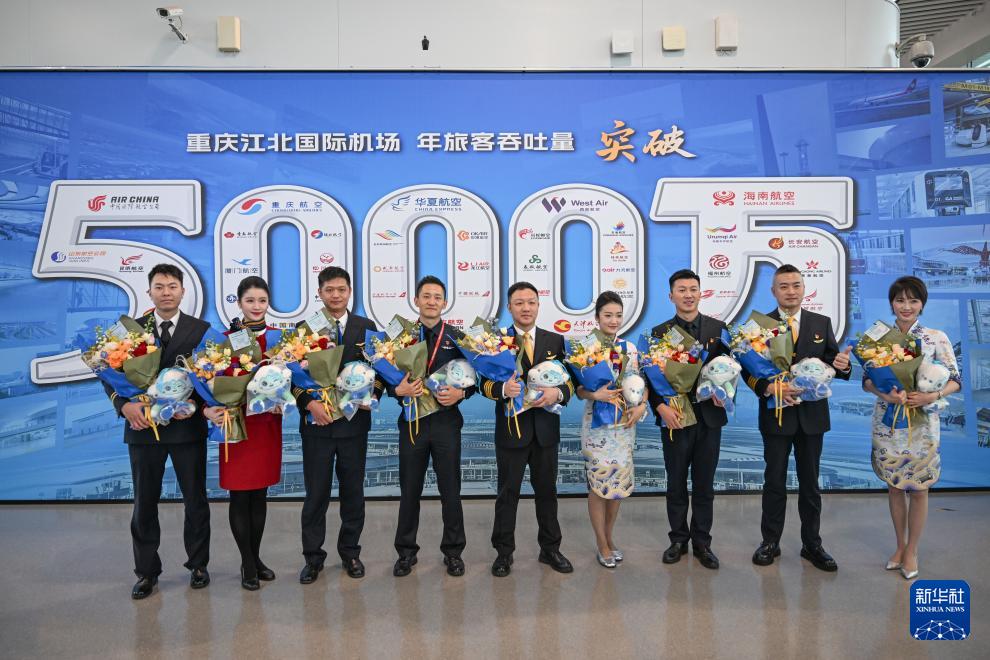 2025年12月31日,乘務(wù)人員在重慶江北國際機場年旅客吞吐量突破5000萬人次的紀念墻前合影。