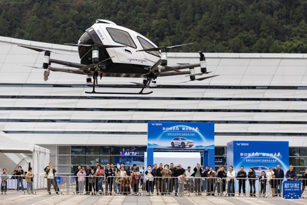 2025年11月13日,在四川省宜賓市國際會展中心2025年動力電池應(yīng)用生態(tài)展覽會現(xiàn)場,參與秋季研學的家長與孩子在觀看一架電動垂直起降飛行器升空。