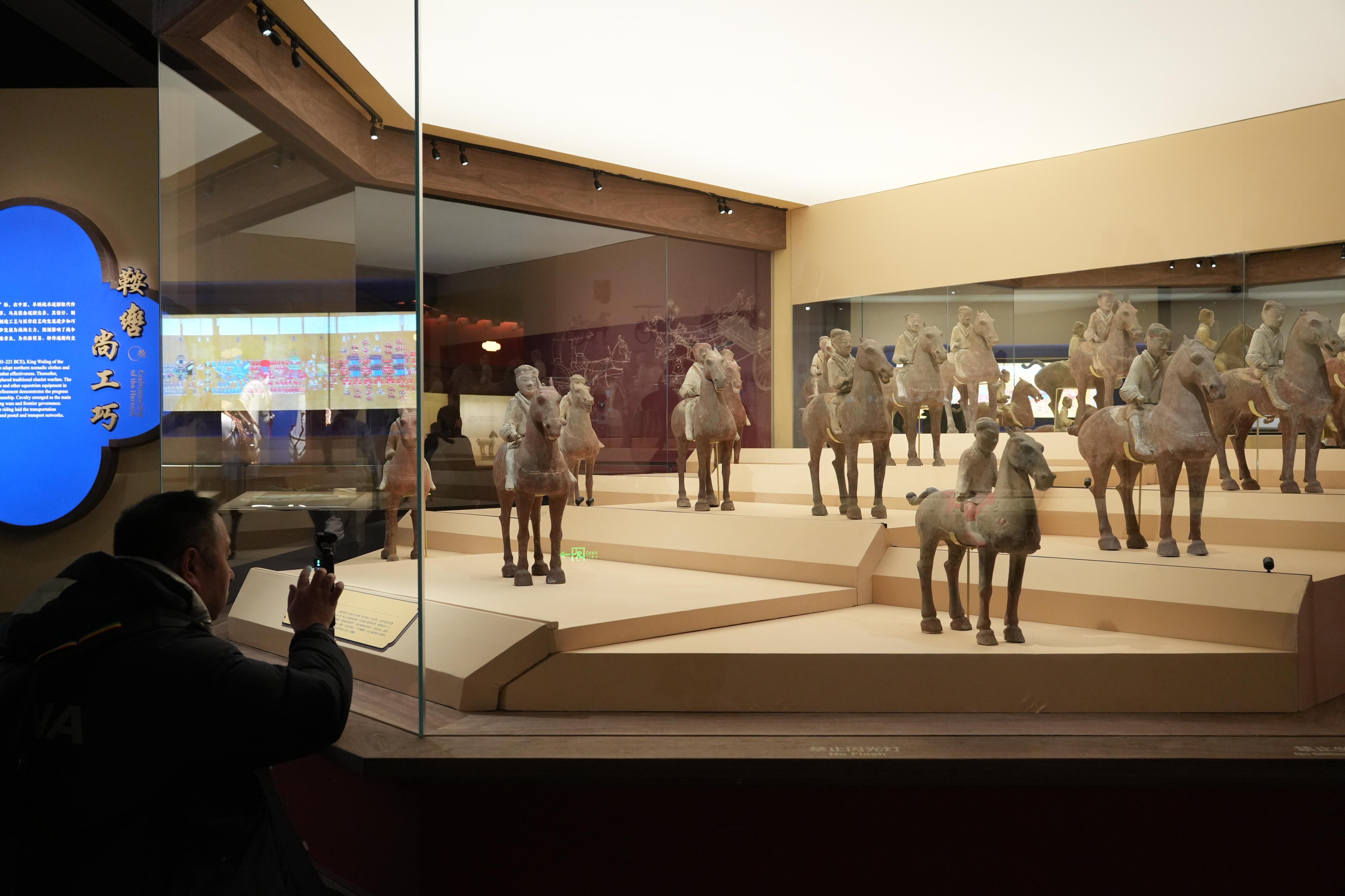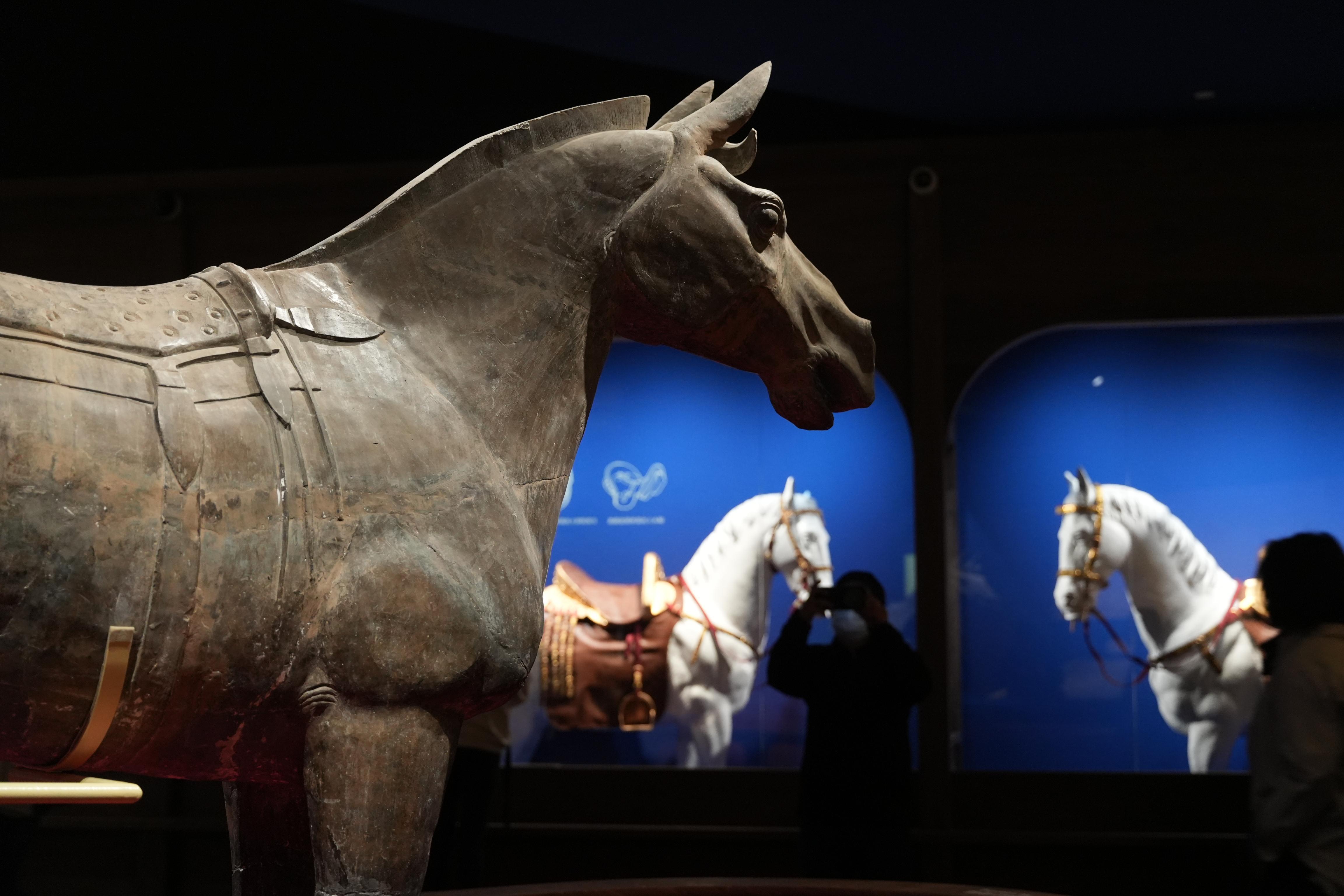 展覽展出了來(lái)自秦始皇帝陵博物院的鞍馬俑。鞍馬是騎兵的坐騎,四蹄矗立,勁健有力,兩耳如削竹,耳前有鬃花,尾巴成辮形,馬背上皆有鞍韉。鞍馬俑塑造了秦代戰(zhàn)馬健壯有力的形象,反映了秦代篩選戰(zhàn)馬的標(biāo)準(zhǔn)嚴(yán)格。