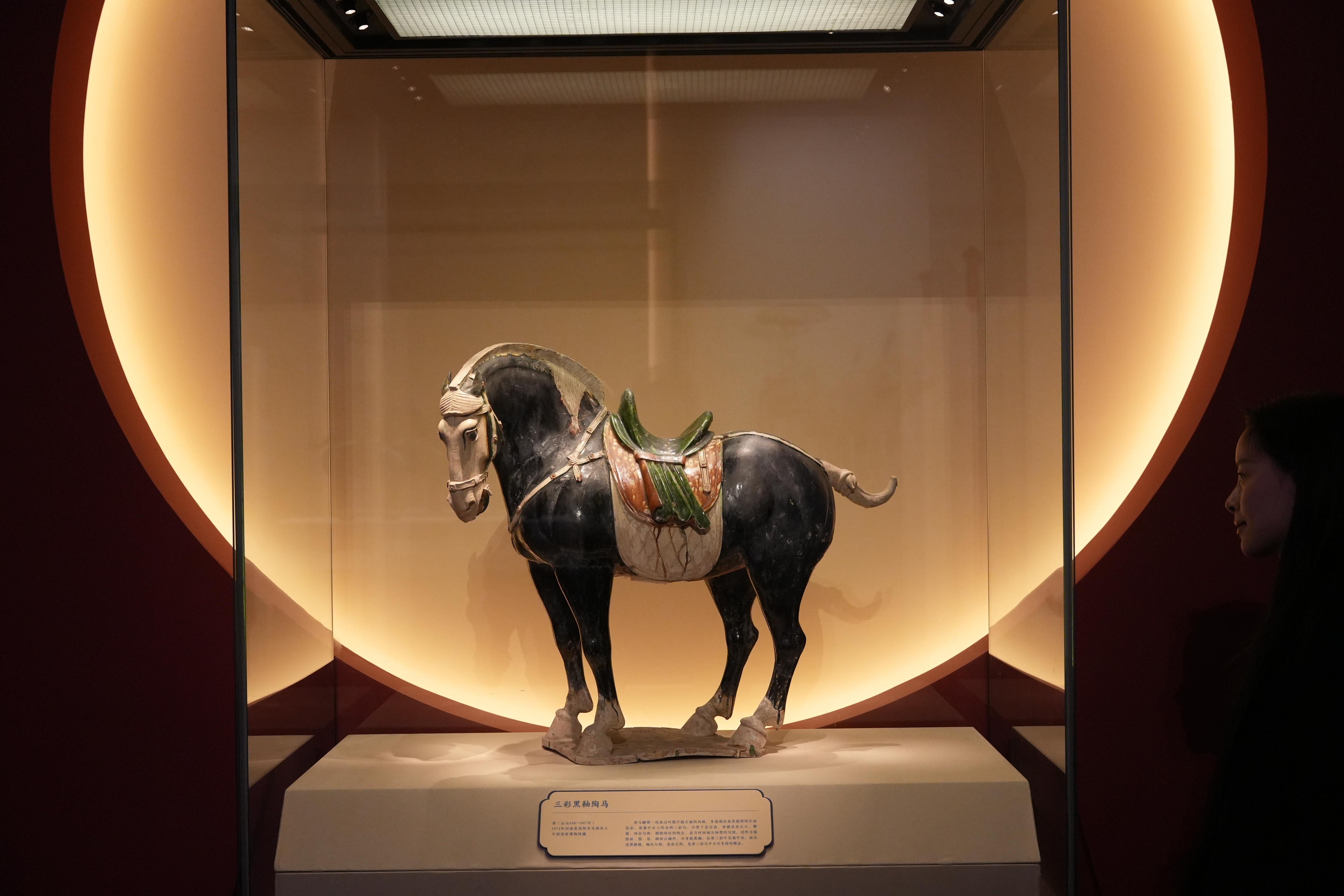 一同展出的還有國(guó)博館藏的三彩黑釉陶馬。除了面、鬃、尾、蹄涂白釉,它全身披黑釉,在唐三彩中實(shí)屬罕見(jiàn),而且造型雄健,釉色勻稱(chēng),姿態(tài)自然,是唐三彩馬中不可多得的精品。圍繞該藏品,國(guó)博還推出了“一匹黑馬”系列馬年限定文創(chuàng)產(chǎn)品。