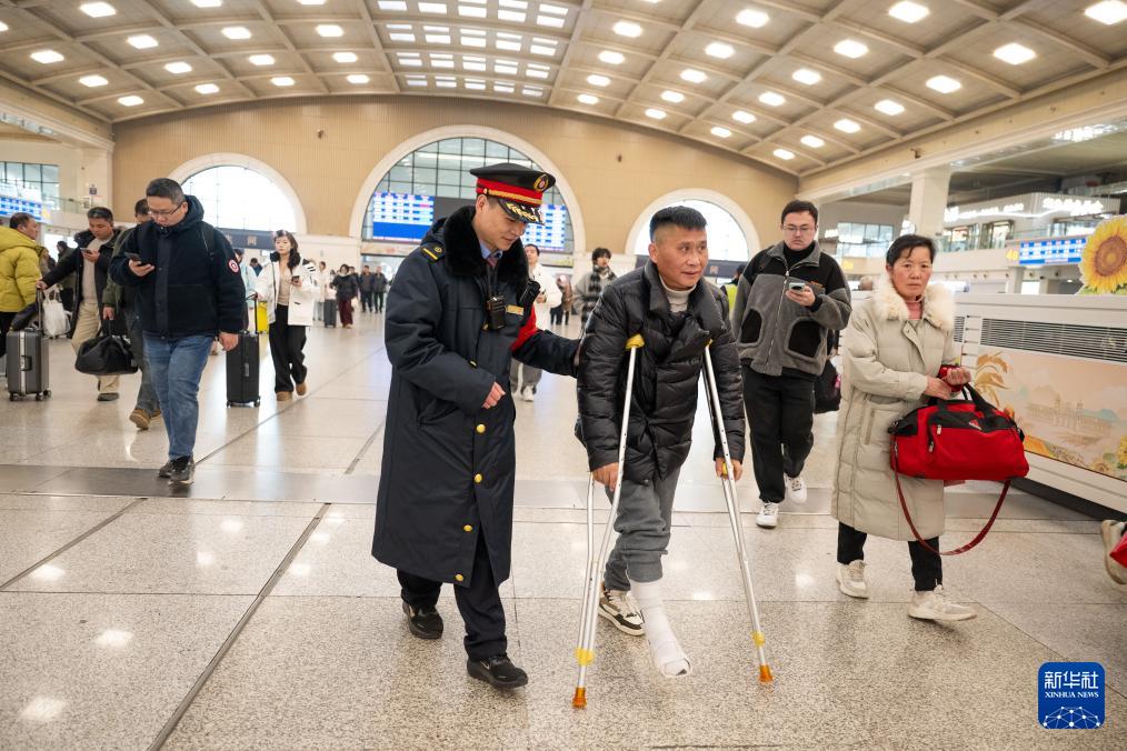 2月2日,在貴州施秉站,青年志愿者護送腳部受傷的返鄉(xiāng)旅客出站。