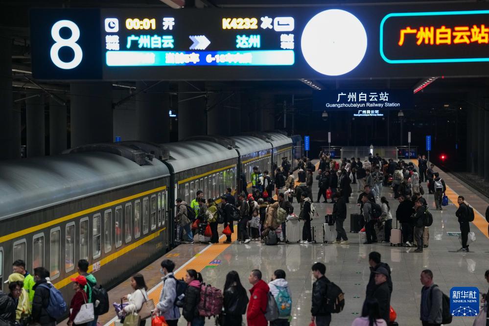 2月1日深夜,在廣州白云站,乘坐K4232次列車的旅客準備上車。2月2日凌晨0時01分,開往四川達州的K4232次列車緩緩駛離廣州白云站,這是2026年粵港澳大灣區(qū)開出的首趟春運列車。