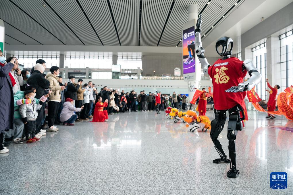 2月2日,乘客在合肥南站觀看機器人拜年表演。