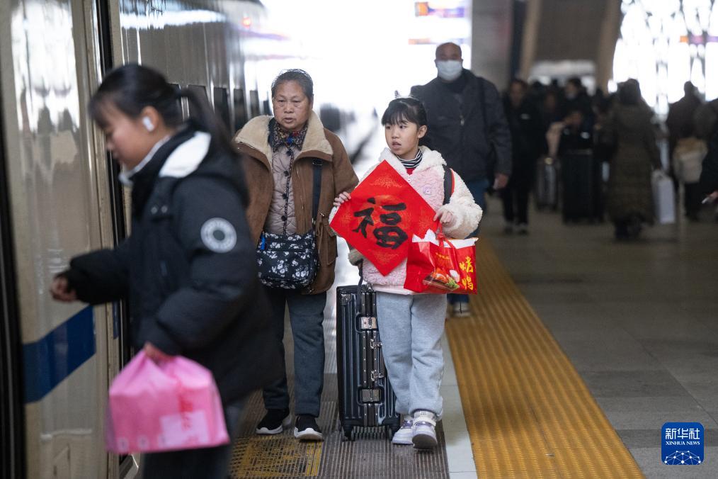 2月2日,在北京西站,小朋友(前左)跟隨家長進站乘車。