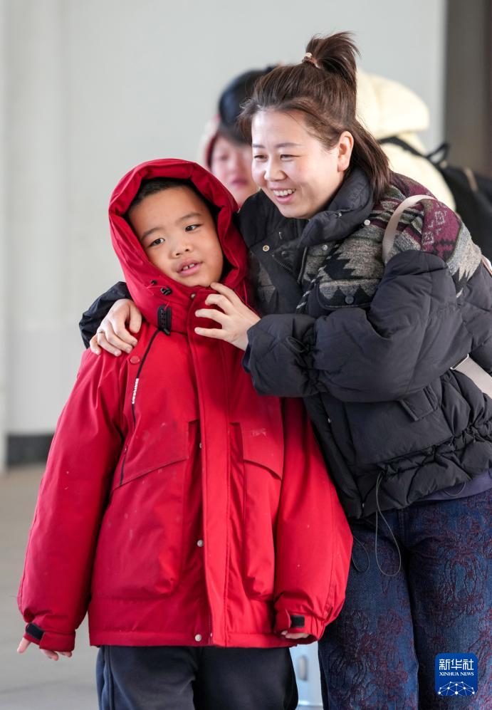 2月2日,在烏魯木齊站,一名小朋友與家人告別。