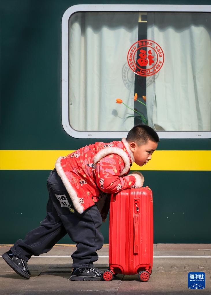 2月2日,在北京西站,小朋友跟隨家長進站乘車。