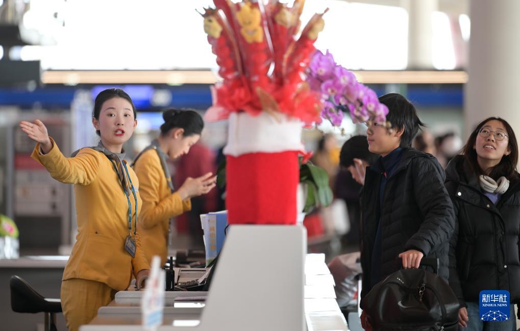 2月2日,北京首都國際機場旅客服務中心工作人員為旅客提供指引、咨詢等服務。