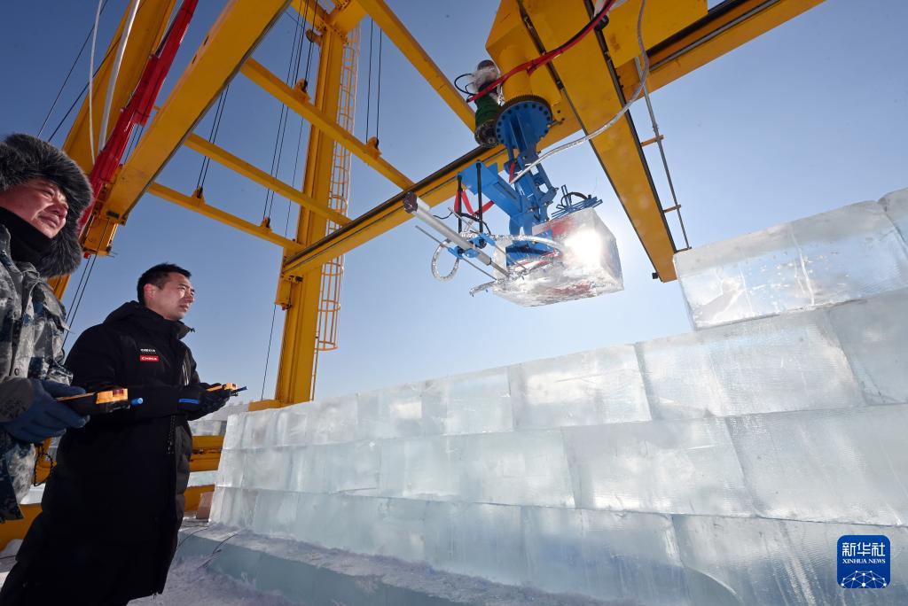 2月3日,在第二十七屆哈爾濱冰雪大世界園區(qū),智能大型冰雕自動化搭建機(jī)器人進(jìn)行冰塊的提升、搬運(yùn)與砌筑。