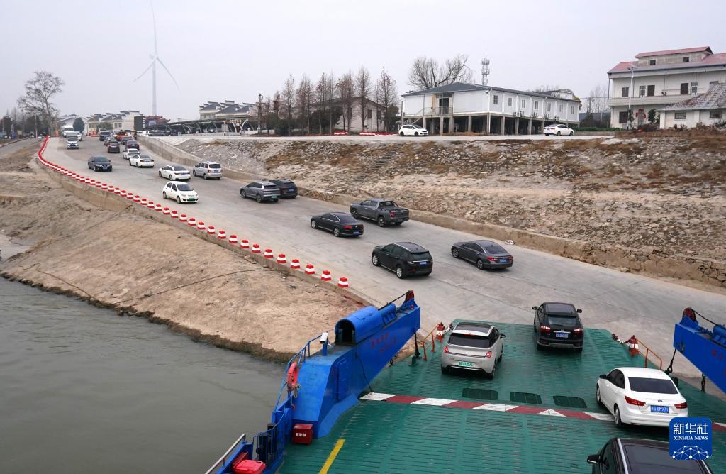 人們駕駛汽車通過輪渡登上棉船島(1月29日攝)。
