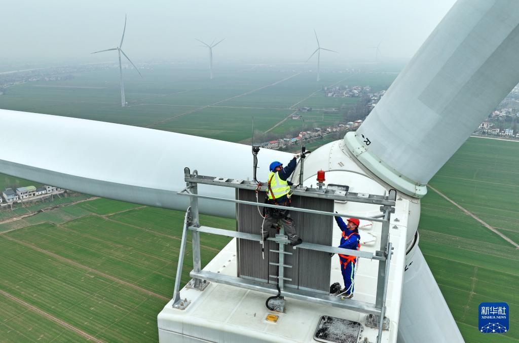 工人對(duì)風(fēng)電機(jī)組進(jìn)行檢修維護(hù)(1月29日攝,無人機(jī)照片)。