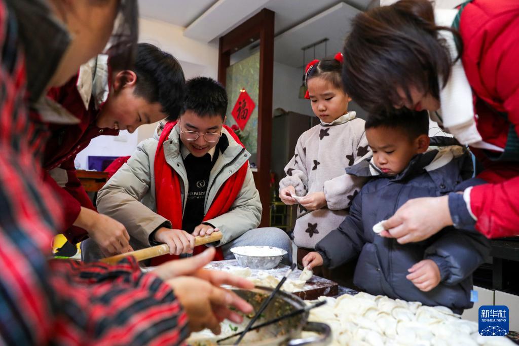 2月16日,在江蘇省揚(yáng)州市邗江區(qū)荷葉小區(qū)一戶人家,大人帶著孩子包餃子。