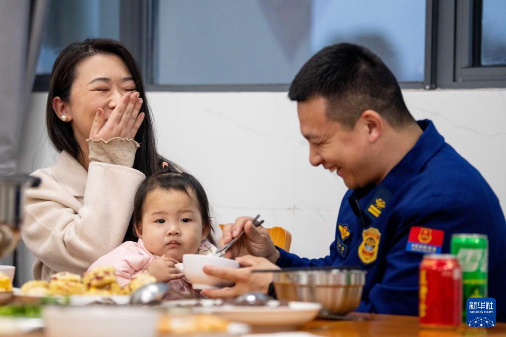 2月16日,在江蘇省泰興市澄江西路消防救援站,消防員和家屬一起吃團(tuán)圓飯。
