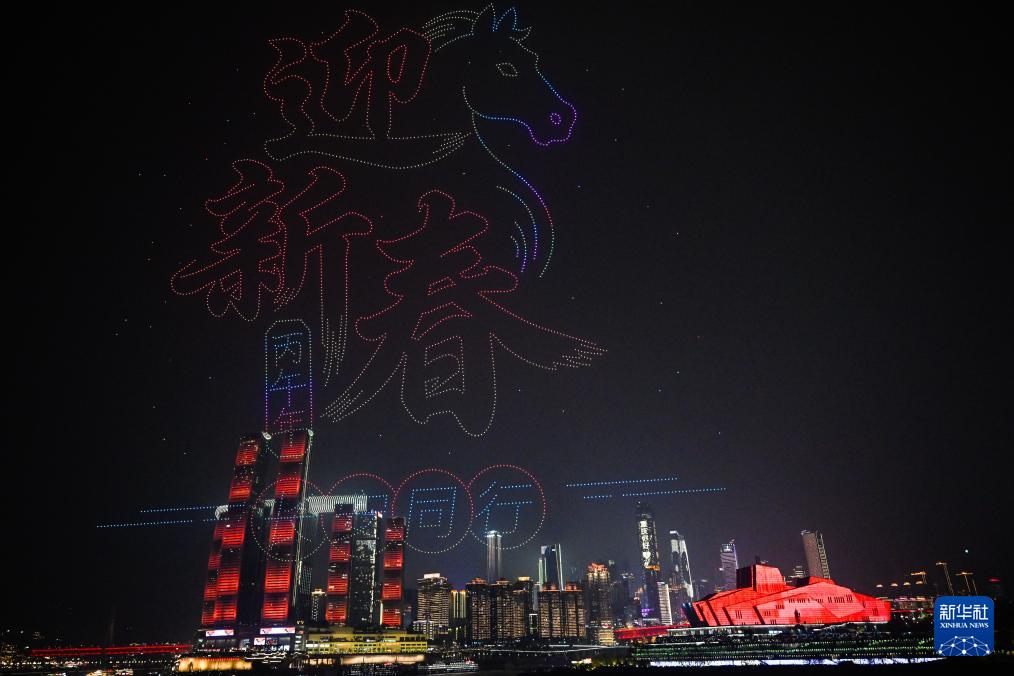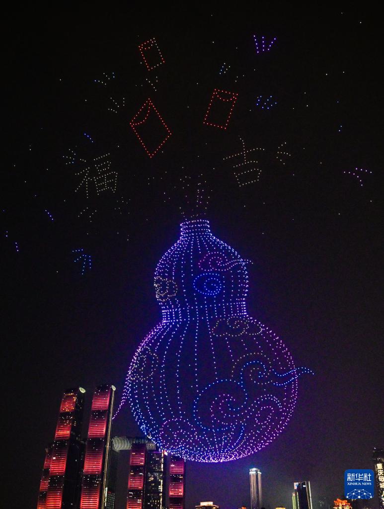 大年初一,“新韻重慶”無人機(jī)燈光秀在重慶夜空上演。無人機(jī)燈光隊(duì)列組成各種創(chuàng)意圖案,點(diǎn)亮夜空,為觀眾獻(xiàn)上視覺盛宴。