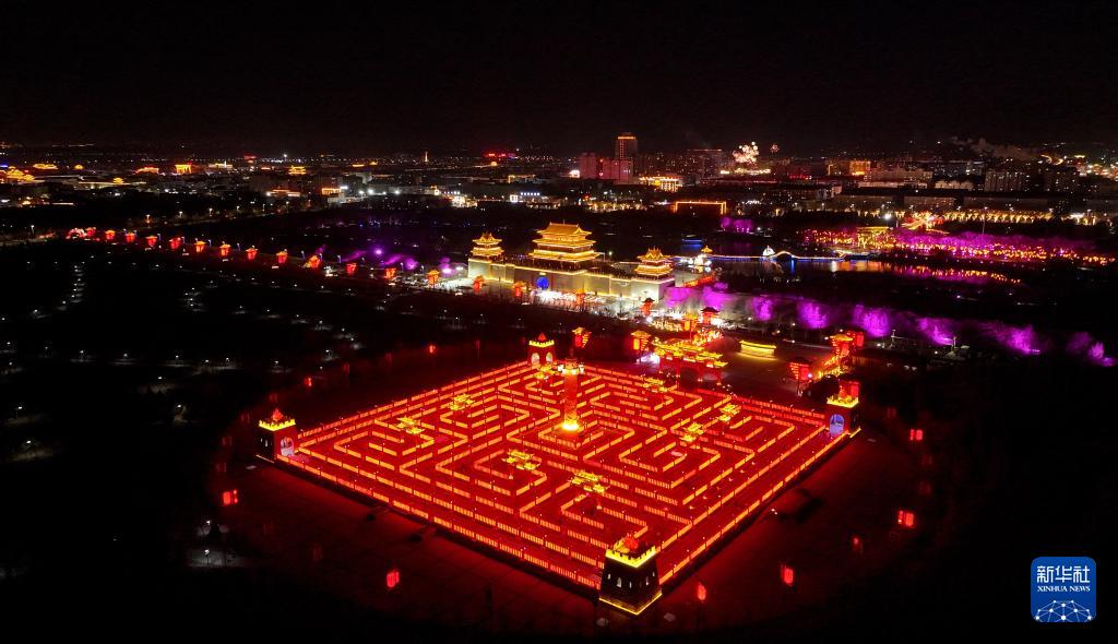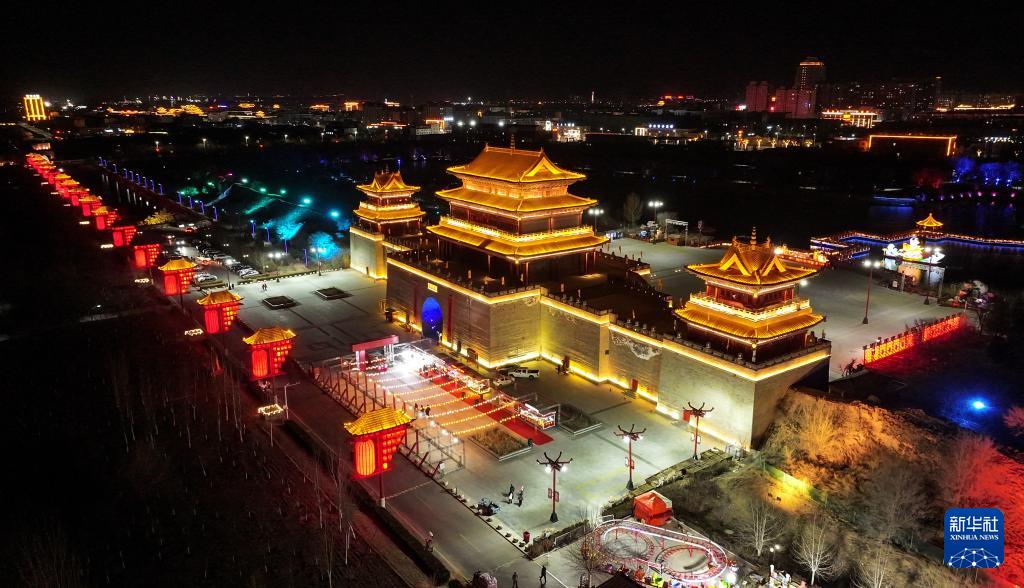 這是2月18日拍攝的寧夏鹽池縣九曲民俗文化園和長(zhǎng)城關(guān)夜景(無人機(jī)照片)。