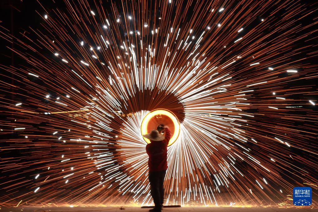 2月18日晚,在河南省安陽(yáng)市內(nèi)黃縣文化體育中心,民間藝人表演打鐵花。