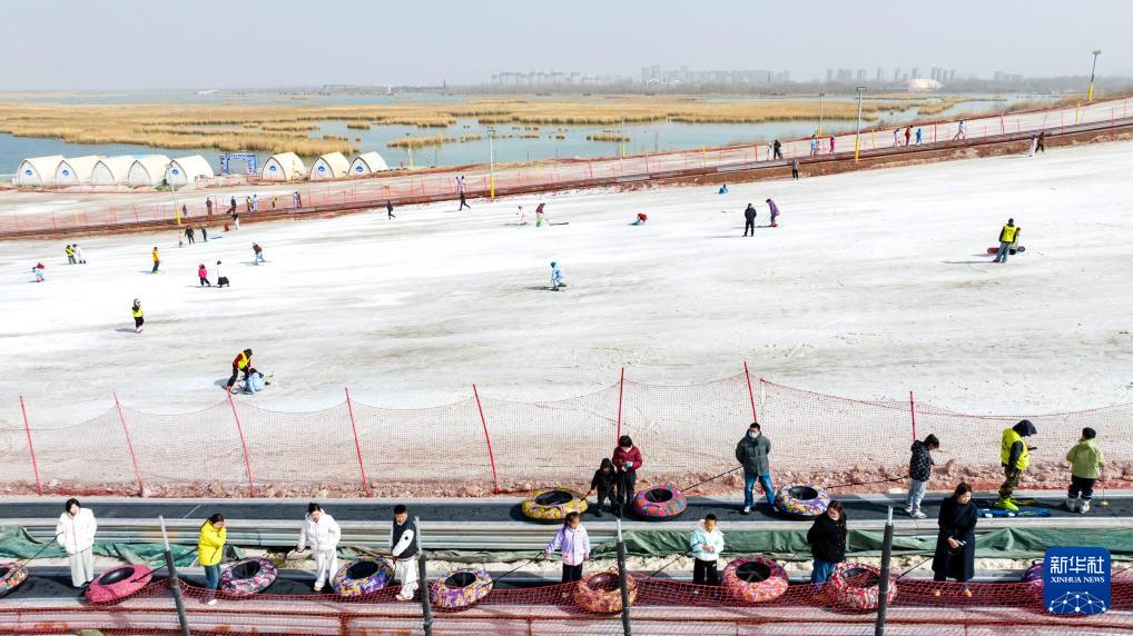2月22日,市民在寧夏銀川市閱?;﹫鲶w驗(yàn)冰雪運(yùn)動(dòng)(無人機(jī)照片)。