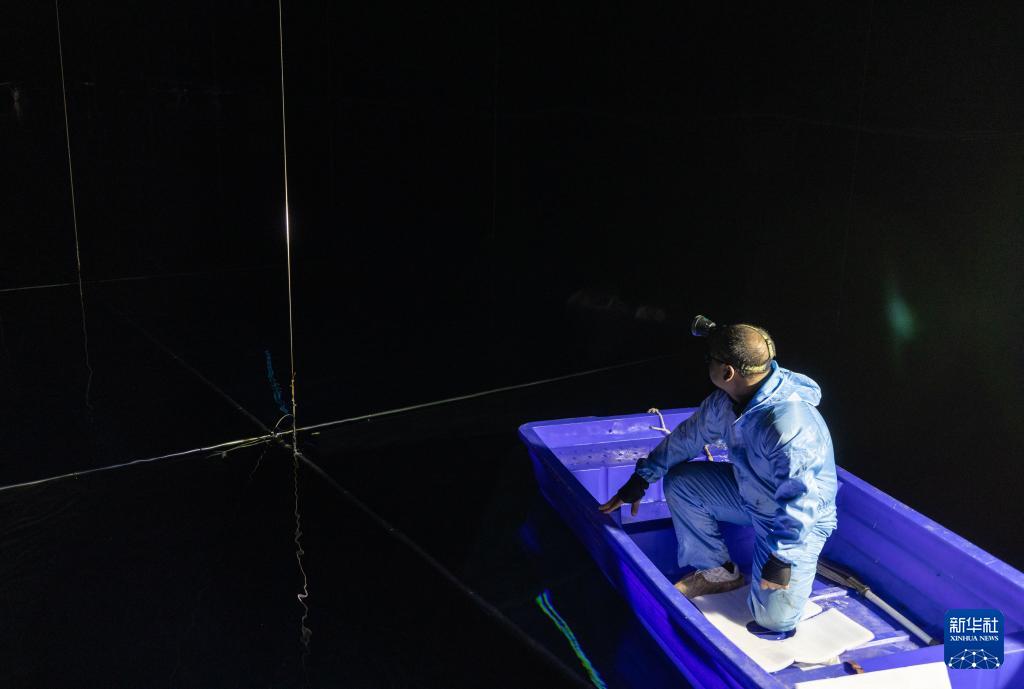 2023年4月21日,在位于四川省稻城縣海子山的高海拔宇宙線觀測(cè)站“拉索”水切倫科夫探測(cè)器陣列水池,科研人員坐船更換實(shí)驗(yàn)設(shè)備。