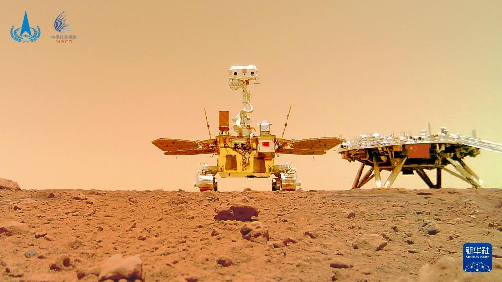 2021年6月11日,國(guó)家航天局在北京舉行天問(wèn)一號(hào)探測(cè)器著陸火星首批科學(xué)影像圖揭幕儀式,公布了由祝融號(hào)火星車拍攝的著陸點(diǎn)全景、火星地形地貌、“中國(guó)印跡”和“著巡合影”等影像圖。這是“著巡合影”圖。