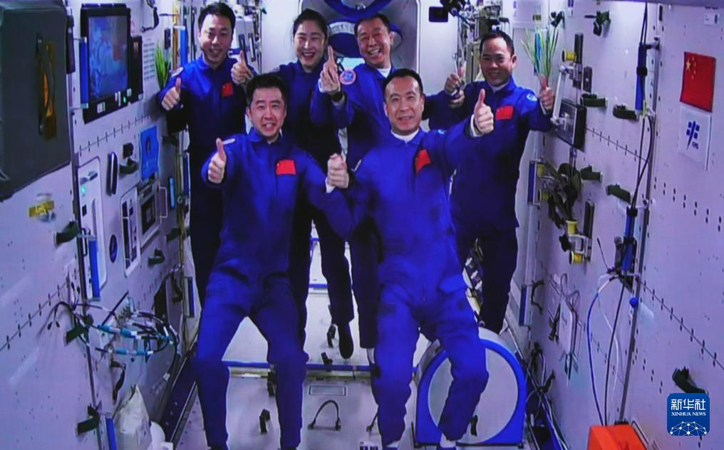 2022年11月30日在酒泉衛(wèi)星發(fā)射中心拍攝的神舟十五號(hào)航天員乘組與神舟十四號(hào)航天員乘組太空合影的畫面。