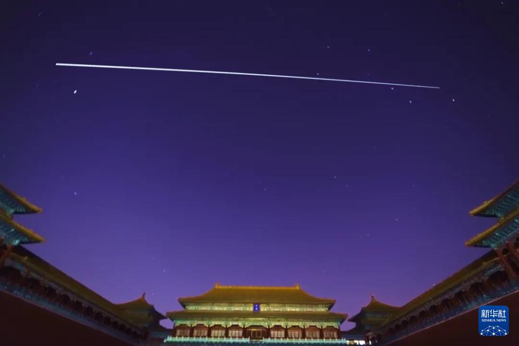 2021年11月19日,在北京故宮午門拍攝的中國(guó)空間站過(guò)境照片(軌跡為多張照片堆棧)。