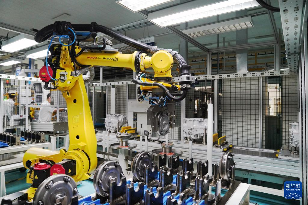 2025年7月24日,在哈爾濱東安汽車動(dòng)力股份有限公司生產(chǎn)車間,工業(yè)機(jī)器人在生產(chǎn)作業(yè)。