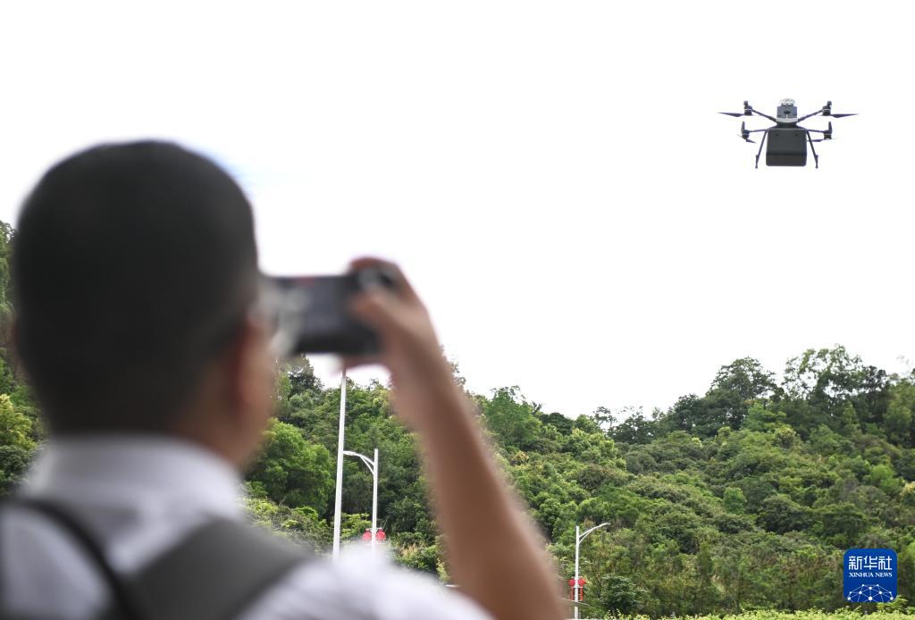 2025年6月26日,參觀者在聯(lián)合飛機(jī)集團(tuán)深圳基地拍攝飛行中的物流無(wú)人機(jī)。