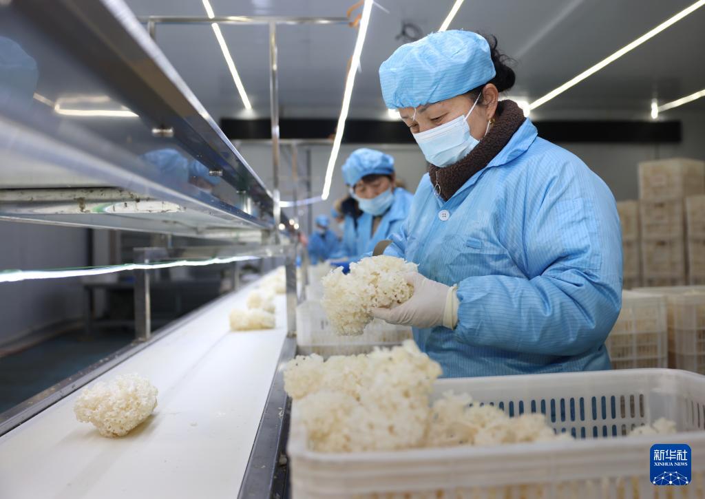 2月27日,河北省新河縣眾樂種植專業(yè)合作社工人在加工車間分揀繡球菌。