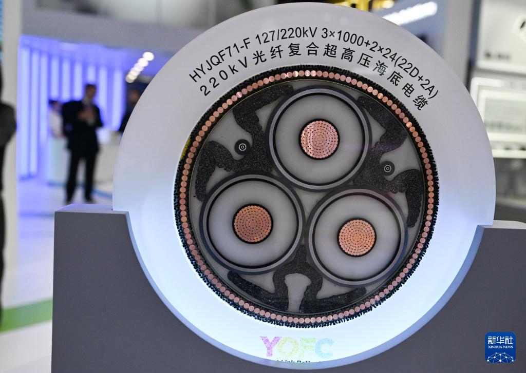這是3月2日在西班牙巴塞羅那舉辦的世界移動(dòng)通信大會(huì)上拍攝的長(zhǎng)飛光纖生產(chǎn)的光纖復(fù)合超高壓海底電纜。