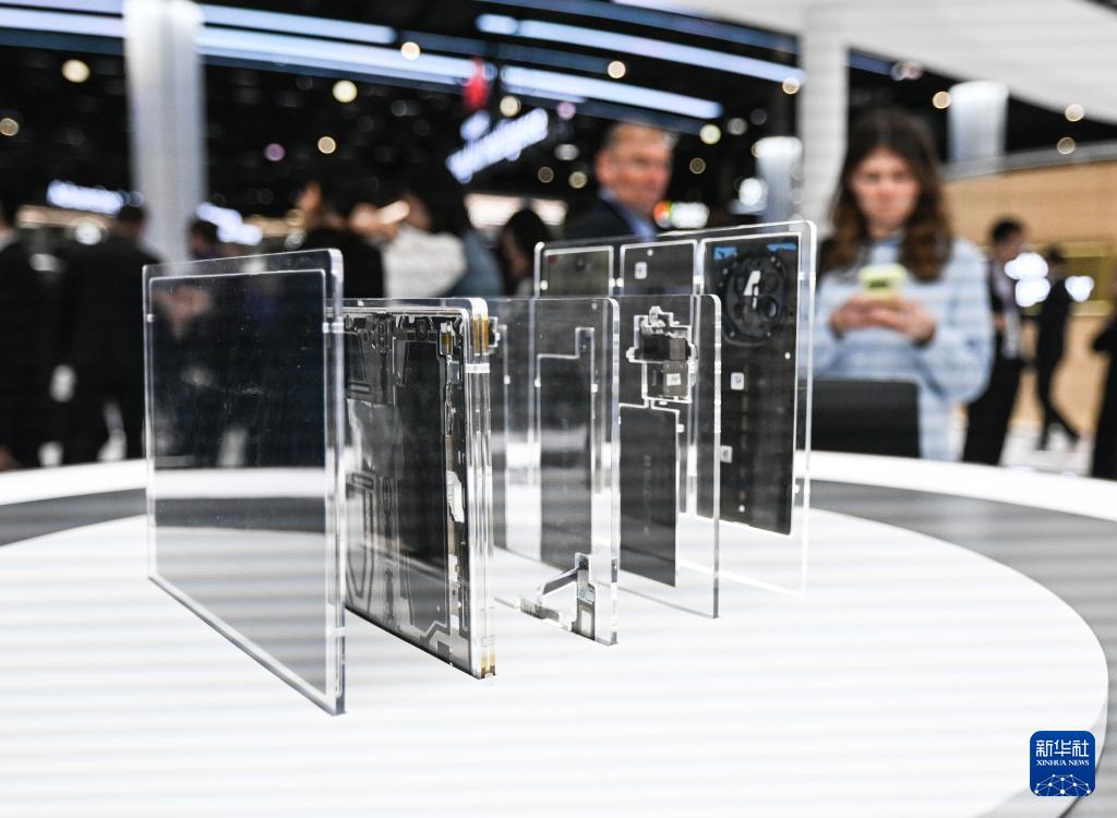 3月3日,在西班牙巴塞羅那舉辦的世界移動(dòng)通信大會(huì)上,參觀者在華為展臺(tái)觀看折疊屏手機(jī)的內(nèi)部結(jié)構(gòu)。
