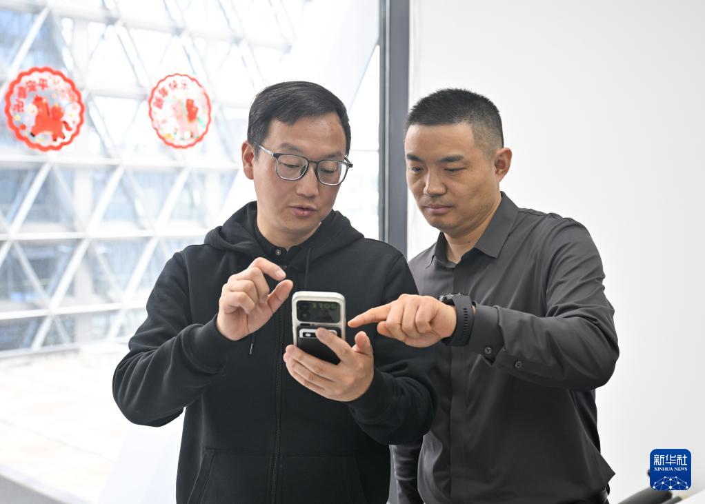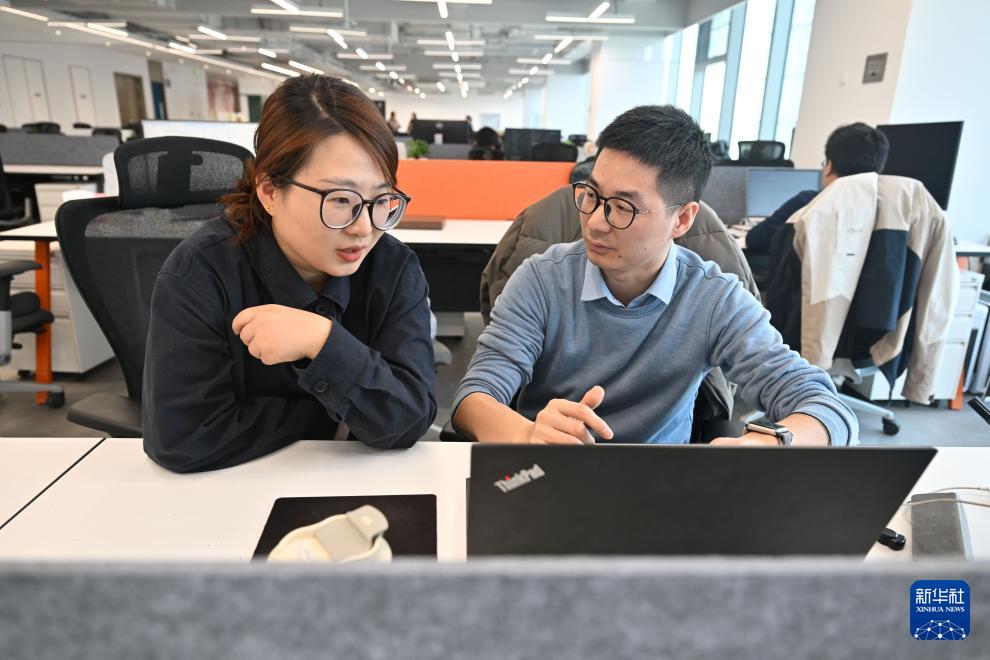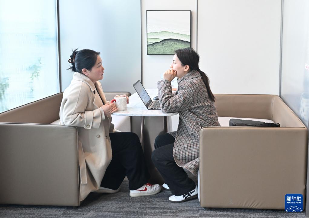 3月11日,在位于中國(南京)軟件谷的 “質能·工坊”O(jiān)PC 社區(qū),南京棋盤石智能科技有限公司創(chuàng)始人王磊(右)和隔壁辦公室的創(chuàng)業(yè)者討論合作項目。