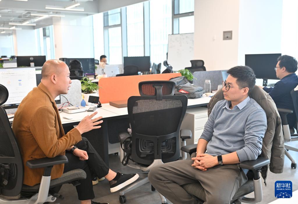 3月12日,在位于南京河西中央科創(chuàng)區(qū)的阿里中心親橙OPC社區(qū),昱脈科技創(chuàng)始人王鵬(右)和相鄰工位的創(chuàng)業(yè)者交流。