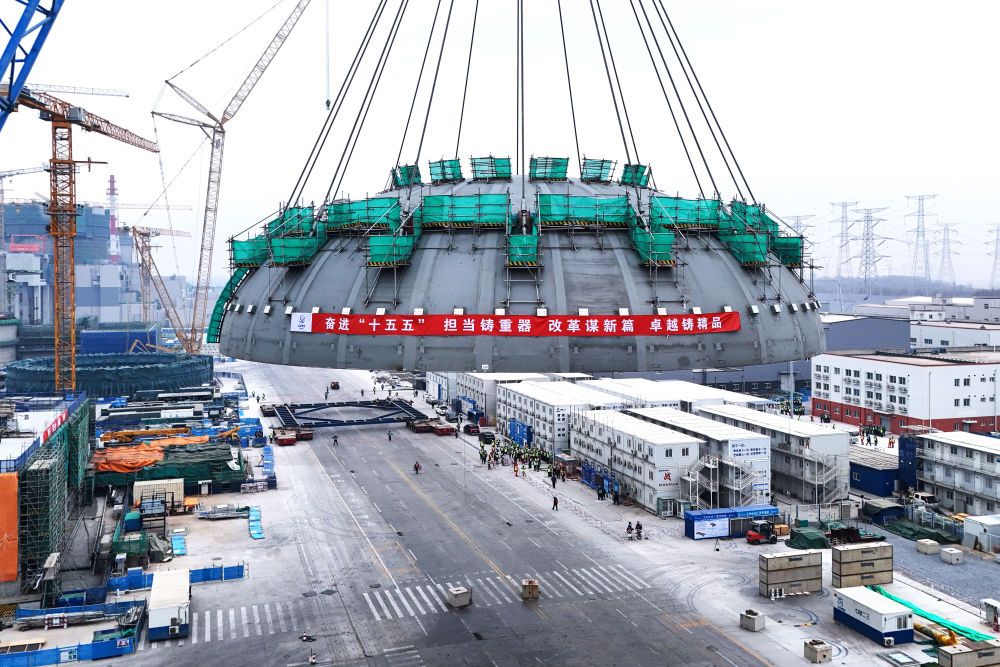 2026年2月10日在遼寧省葫蘆島市拍攝的徐大堡核電站1號(hào)機(jī)組核島鋼制安全殼頂封頭吊裝作業(yè)現(xiàn)場(chǎng)(無人機(jī)照片)。新華社發(fā)