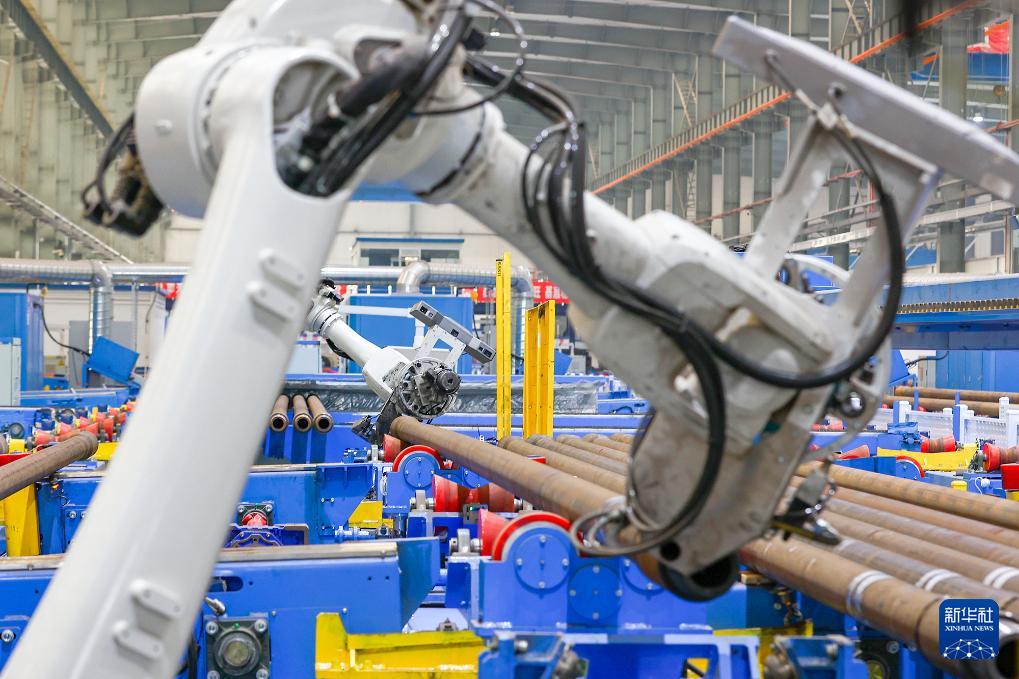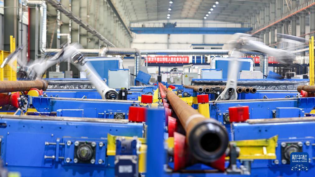 3月17日,在中海油服鉆井事業(yè)部鉆具檢維修自動化車間,機(jī)械臂對鉆桿進(jìn)行保養(yǎng)。