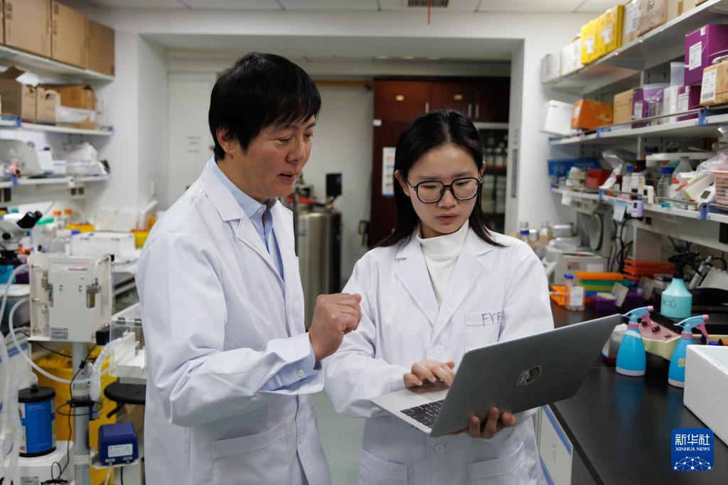 3月17日,在中國科學(xué)院分子細(xì)胞科學(xué)卓越創(chuàng)新中心(生物化學(xué)與細(xì)胞生物學(xué)研究所)實(shí)驗(yàn)室,程新研究員(左)和學(xué)生在一起交流。